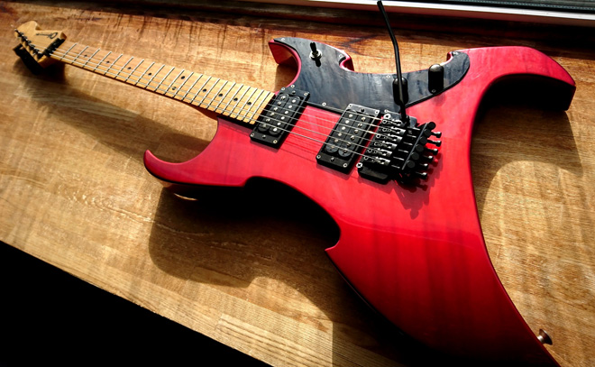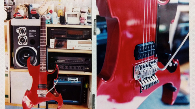 90年だっけかな?某ヤングギター誌の「俺の考えたギター」というデザイン募集コーナーの数ヶ月毎に決まる大賞に輝き、賞品として贈られたボディにパーツをセルフコンポーネントした、自分オリジナルのギターです。