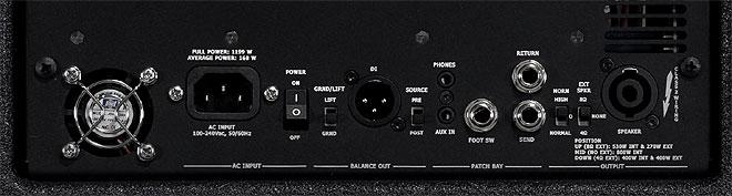 ■入出力端子:<Front Panel> Input <Rear Panel> AC Input、Direct Out、Phones、Aux In、Foot Switsch、Return、Send、Speaker Outputs(speakON)