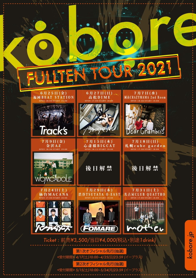 koboreの全国ツアー<kobore「FULLTEN TOUR 2021」>の対バンが一部発表された。