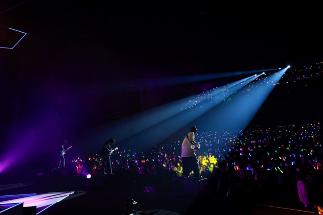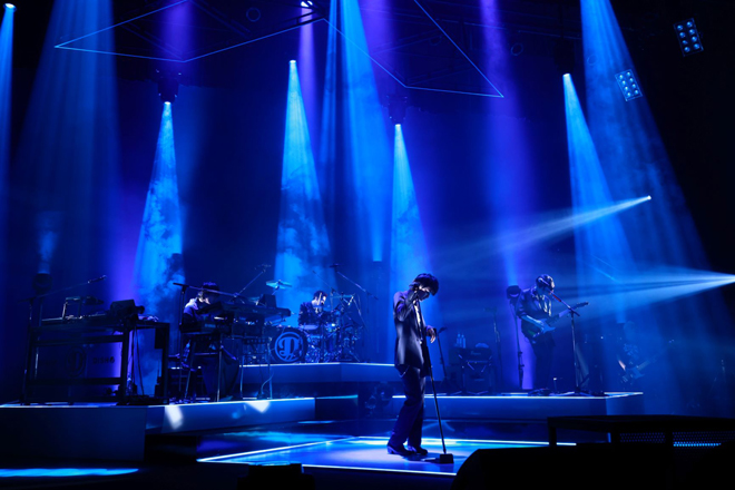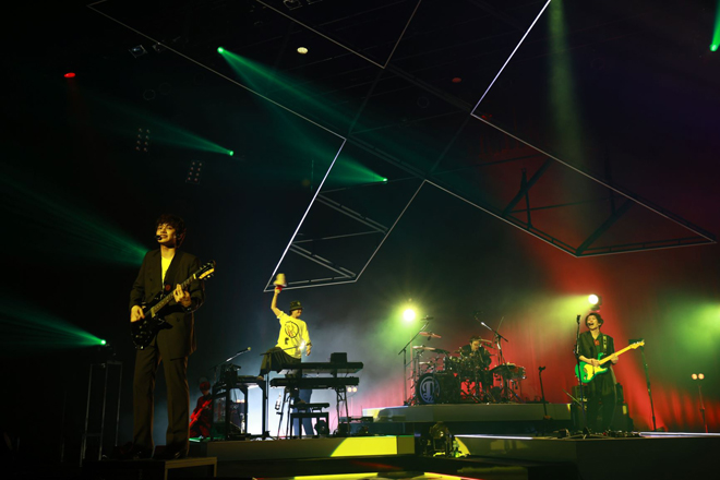 緊迫した静けさが中野サンプラザホールに漂う中、Dr泉大智のカウントにより始まった1曲目は、“宣戦布告”を告げる「ルーザー」。アルバム『X』でも1曲目に収録されているこの楽曲は、挫折、惨敗をしながらも戦い続けてきた彼らの思いが詰まったロックサウンドのナンバーだ。Vo/Gの北村匠海が「ファイナルきたぞー!最後までよろしく!」と力強く呼びかけてライブに幕を開ける。続いて、G&Cho矢部昌暉が奏でる重厚なギターリフと、DJ&Key橘柊生のスクラッチが絡み合うイントロで始まる「rock’n’roller」では、“賽は投げられた 告げられる合図”という歌いだしのように、彼らが歩みだしたDISH//第二章を体現するかのようなロックサウンドを魅せつけた。
