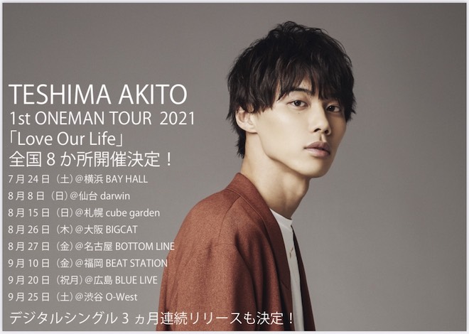 SOLIDEMOの手島章斗が、ソロ名義初となる<1st ONEMAN TOUR 2021「Love Our Life」>を開催すること、6月から3ヶ月連続デジタルシングルのリリースを行うことを発表した。