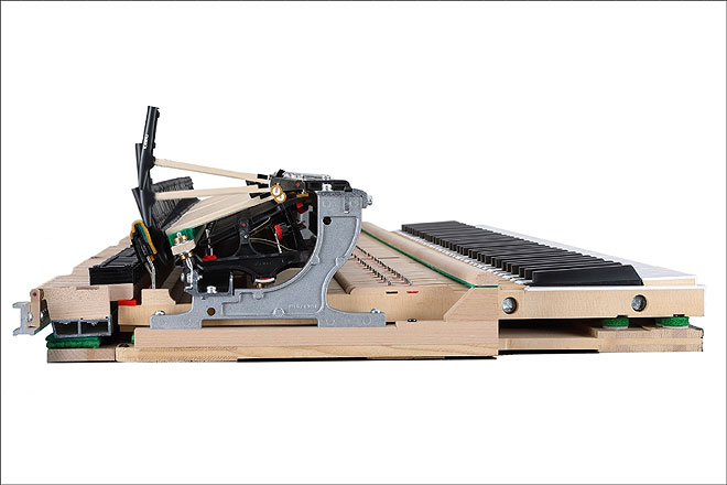 ▲NV5Sの響板スピーカーには低音域用、中高音域用にそれぞれ異なる加振器を搭載し、広帯域でダイナミックな響きを再現している。さらにピアノ内部にもスピーカーを備え、奥行きのある音を楽しめる。
