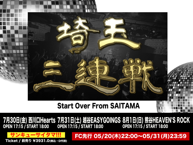 チケット価格は“サンキュー サイタマ”にかけた税込“3,931.0”円。モバイルファンクラブ「テレフォン倶楽部」では5月20日(木)22時より先行受付が実施される。