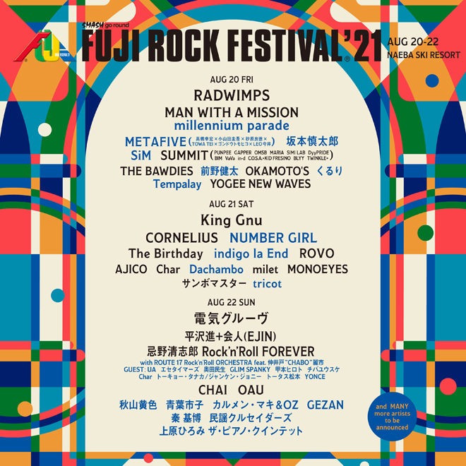 初日8月20日(金)には、常田大希率いる音楽集団millennium paradeが初登場。また、高橋幸宏、小山田圭吾、砂原良徳、TOWA TEI、ゴンドウトモヒコ、LEO今井によるMETAFIVEや、坂本慎太郎、くるり、SiM、前野健太、Tempalayが出演する。8月21日(土)には、2019年に再結成したNUMBER GIRLや、indigo la End、Dachambo、tricotの出演が明らかになった。最終日の8月22日(日)には、ジャズ・ピアニスト上原ひろみがピアノ・クインテットで登場。また、GEZAN、秦 基博、秋山黄色、青葉市子、カルメン・マキ&OZ、民謡クルセイダーズの出演も明らかになっている。さらに、「忌野清志郎 Rock’n’Roll FOREVER」に出演するゲスト勢についても発表されており、UA、エセタイマーズ、奥田民生、GLIM SPANKY、甲本ヒロト、チバユウスケ、Char、トーキョー・タナカ/ジャンケン・ジョニー、トータス松本、YONCEというフジロックのこのステージでしか観る事のできないメンツがロックンロール・ショーを披露する。