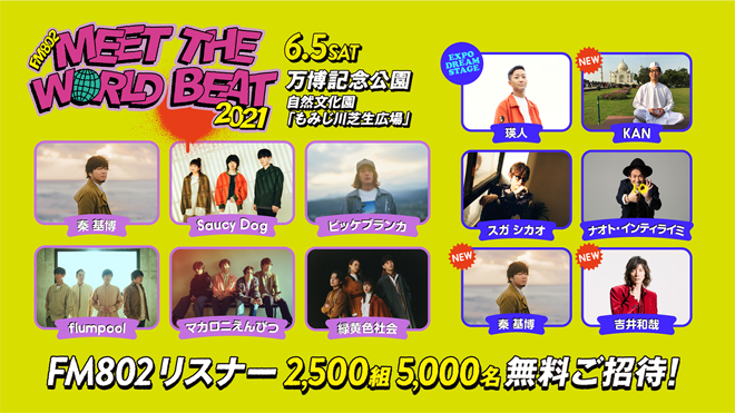 FM802主催の野外フリーコンサート<FM802 MEET THE WORLD BEAT 2021>が、6月5日に大阪・万博記念公園自然文化園「もみじ川芝生広場」にて開催される。スペシャルバンド企画のシンガーとしてKAN、秦 基博、吉井和哉の参加が決定した。