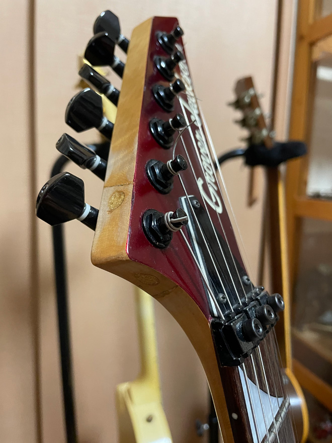 ヘッドはDIYで補修して塗装もエアブラシでリカバリー。ピックアップ交換にタップ改造と使えるギターにと愛情を注ぎました。そして、我が家に数本ある本家レスポールを押し退けて立派なメインギターになりました。