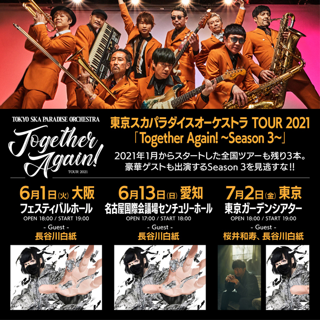 東京スカパラダイスオーケストラによるTOUR 2021<Together Again! ~Season 3~>のゲストに、長谷川白紙、Mr.Childrenの桜井和寿がゲスト出演することが明らかになった。