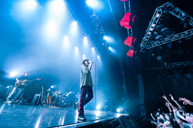 「こんな景色を見るのはいつ振りだろうな」。眼前の聴衆と相対したiriはそう語ると、昨年、自粛期間中に制作が進められた2021年の最新EPからタイトル曲の『はじまりの日』を披露。別れの季節を前に、前向きになれない心境をありのままに描くエモーショナルな歌の力が普遍的なメロディを紡ぐバンドサウンドのなかで、ぐっと存在感を増していった。そして、「room」、「回る」と続く最新EPの内省的な世界を浮かび漂い、ジャジーなヒップホップナンバー「Keep on trying」から葛藤を抱えながらも未来に向かってゆく力強い意志が込められた「Only One」へ。そのメッセージは会場を鼓舞するように響いた。
