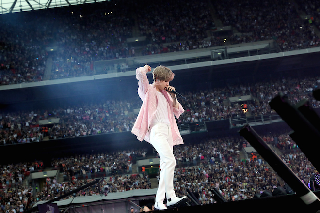 2度目のロンドンでBTSが立ったのは、歴史あるウェンブリースタジアム。韓国アーティスト初となる快挙で、彼らの歴史に新たな1ページを刻んだ。MCではイギリスが生んだ名作『ハリー・ポッター』を話題に出し、Vは魔法で光を操って会場中を紫に染め上げていた。