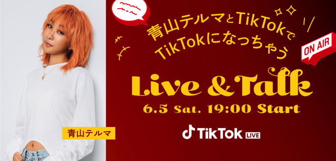 6月5日の『青山テルマとTikTokでTikTokになっちゃうLIVE&TALK』では「ONIGIRI」などのライブパフォーマンスに加えて、音楽やグルメにまつわるトークも予定。また、<#TikTokグルメ王>で「ONIGIRI」を音源に使った優秀投稿者の発表も行われるということだ。