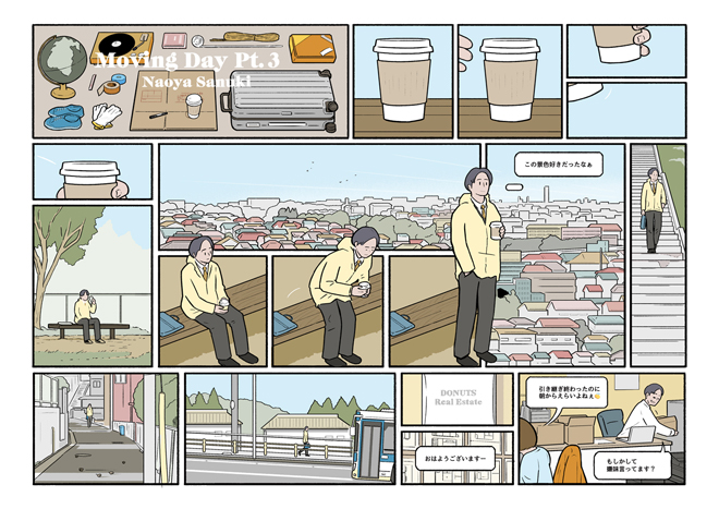 同漫画は、CDショップ等で配布していたフリーペーパーにも掲載されているもの。『Moving Days』のアートワークを担当した京都出身の漫画家・イラストレーターのサヌキナオヤが手がけた。