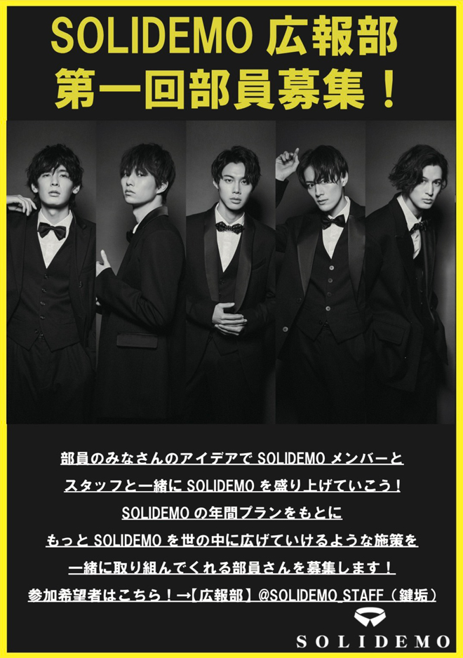 この企画は、SOLIDEMOメンバー、スタッフと共に、「SOLIDEMOを世の中に広げていけるような活動に一緒に取り組む部員」を募集するというもの。入会希望者は「SOLIDEMO 広報部」のTwitterアカウントにフォローリクエストを送ろう。今後の活動内容はTwitterにて発表される。