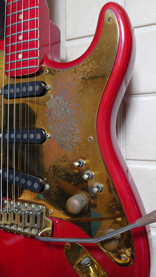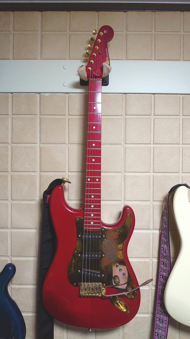 指板まで真っ赤ということで大きな注目を集めていましたよね。当時のコンポーネント系STのファイナルアンサー的な一本で、みんな欲しいと思っていたモデルなんじゃないかな。ブラスピックガードがこうなってしまうのは織り込み済みでしたけど、今となってはむしろこの百戦錬磨感がカッコいいと思います。ブラスのノブを触った後って指が10円玉の匂いなんですよね(笑)。てか、色々やろうとしたナットの跡が気になる。(JMN統括編集長 烏丸)