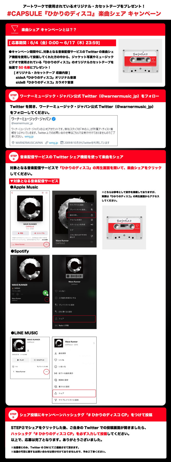 ワーナーミュージック・ジャパンの公式Twitter(@warnermusic_jp)をフォローして、Apple Music/Spotify/LINE MUSIC いずれかの音楽配信サービスのTwitterシェア機能を使って「ひかりのディスコ」をシェア投稿してください。キャンペーンハッシュタグ「#ひかりのディスコCP」を付けて投稿した方の中から抽選で50名様に、ジャケ写やMVで使用されている「ひかりのディスコ」のオリジナルカセットテープをプレゼント。カセットテープのA面には「ひかりのディスコ」オリジナル音源、B面には「ひかりのディスコ」カラオケ音源が収録されます。