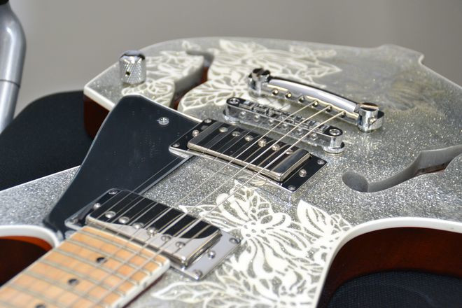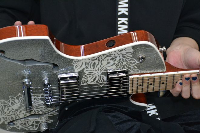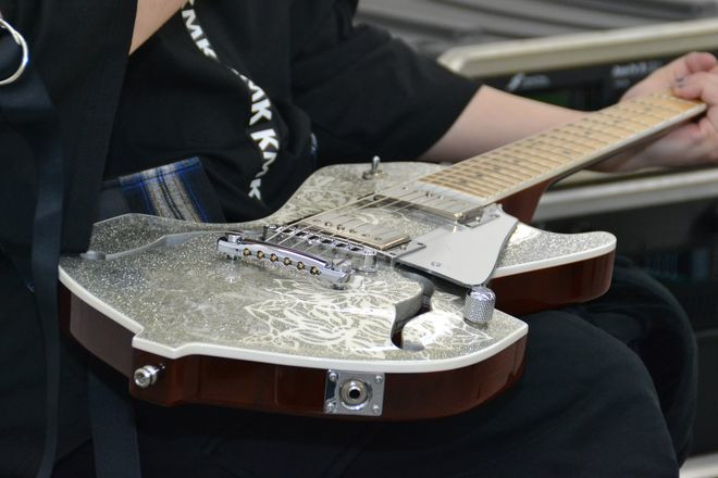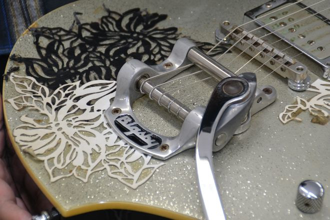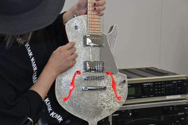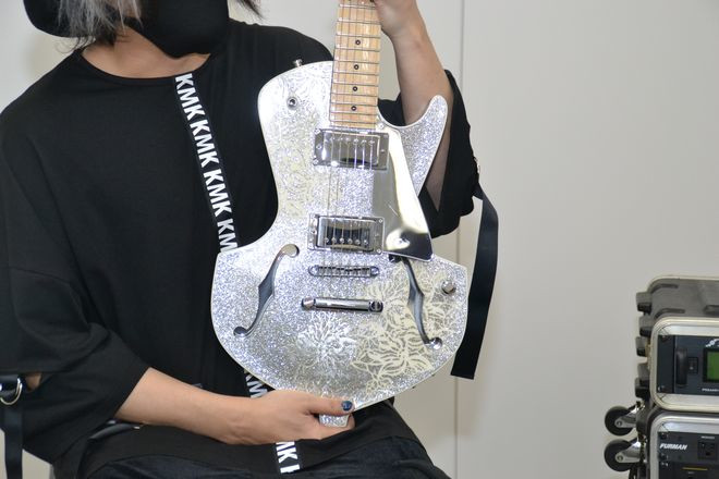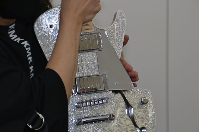 KATSU:シルバーのラメにしたのは、デビューのときにグレッチのシルバージェットを使っていて、それ以降シルバーがイメージカラーになっているので、それを引き継いだものです。模様が入っていますが、これはangelaの衣装で使っているものを貼って、その上にコーティングをしています。だから見た目で言うと、このギターは“小さなangela”といった感じですね。