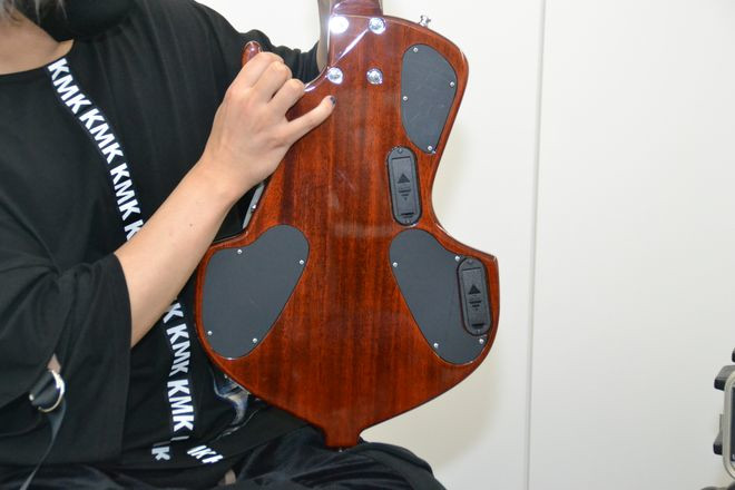 KATSU:軽さですね。ライブで動きやすいことが大事なので。材質はメイプルとマホガニーなので重いはずなんですけど、ボディを薄くしたりして極限まで軽くなっています。たぶん2キロ台後半くらいしかないと思いますし、バランスも良くてヘッド落ちもしない。軽すぎて怖いくらいです(笑)。