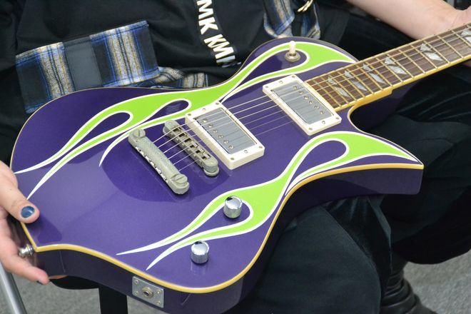KATSU:これは弦が切れたりしたときのためのスペアギターで、先ほどのKATSUモデルのRAVELLEを作ってもらったときに、一緒にもらったものです。ピックアップはダンカンなので、KATSUモデルとはまるで音が違いますね。市販されている普通のRAVELLEですが、ボディ表面のデザインはオリジナルです。これはアメリカでオートバイの塗装業者に塗ってもらったものです。