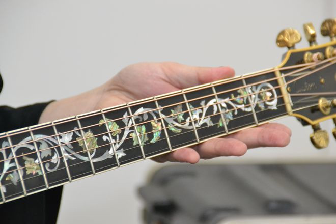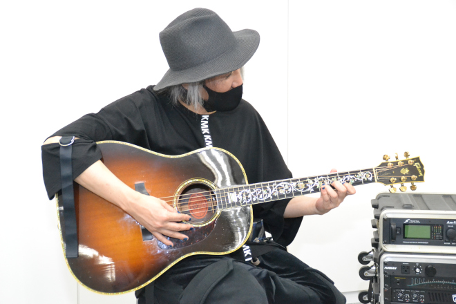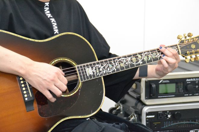 KATSU:デビュー曲の「明日へのbrilliant road」や「綺麗な夜空」のときにJ-45を弾いたことがあったんです。それはレンタルだったんですが、とにかく弾きやすかったので気に入ってしまったんです。それからずっと探していて、やっと見つけたのがこのVineです。ただこれ、豪華なインレイのおかげで指板のポジションがめちゃくちゃわかりにくい(笑)。