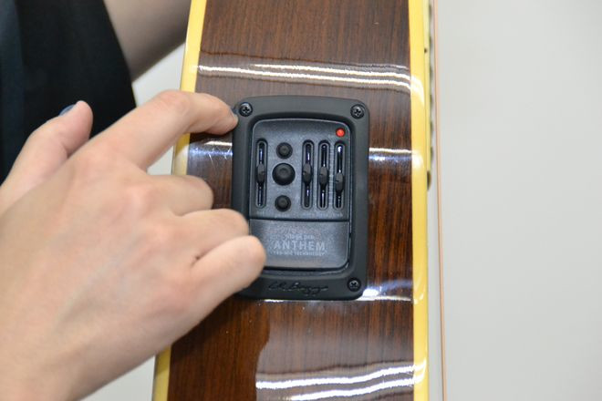 KATSU:J-45に穴をあけるなんて、と思う人もいるかもしれませんが、勇気を出して取り付けました(笑)。ピックアップはL.R.BaggsのAnthemで、ボディ内側のマイクとブリッジのピエゾピックアップの両方で音を拾っていて、手元でそのバランスを調整できます。さらに内側には別のピックアップも貼り付けていて、2系統の出力ができるようになっています。プリアンプはL.R.BaggsのStagePro Anthemですが、取り付け場所が普通とはちょっと違いますね。ライブ中でも見やすく操作しやすい位置にしてあります。