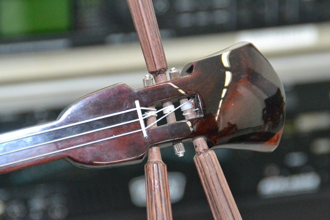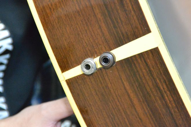 KATSU:胴の内側にピックアップを付けてあります。ボリュームコントロールも付けてあるので、ギターと同じように使えますね。ギターのブリッジに当たるウマと呼ばれるパーツは、津軽三味線のものに換えてあります。元のままだと、ライブで動いたときに倒れてしまうので。あと、これはその店ならではの仕様なんだそうですが、カラクイという糸巻の部分。これは普通の三線では押し込んで固定するため、使っていくとすり減って緩んだりするそうですが、これはギターのペグのようにギア式になっていて、チューニングが確実にできるようになっています。