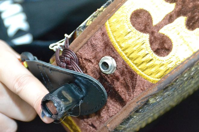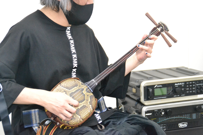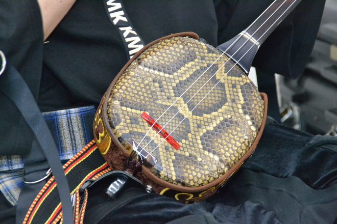 KATSU:ニシキヘビの皮を使っているのが、三線らしいところですね。プリントしたものを貼ることも多いそうですが、これは本物のニシキヘビの皮です。ただ、本物の皮は2年くらいで劣化してしまうらしいので、下に人工の皮を貼ったうえで、トップに本物の皮を貼ってあります。三線って、お酒を飲んだりして楽しい場で弾くことが多いらしいです。だから楽器としてはユルいところもあるんですが、それも含めて三線らしさなんだと思います。