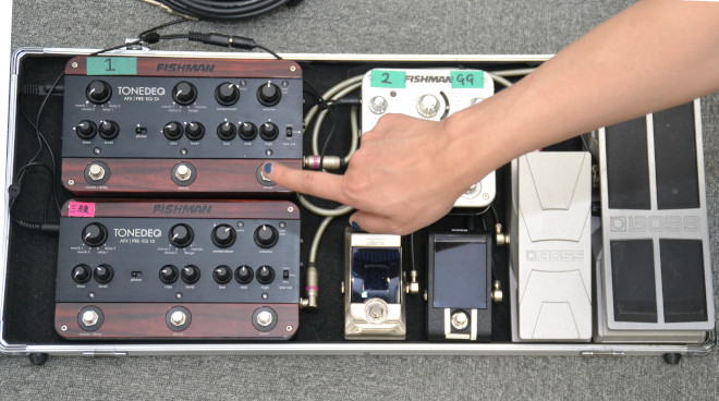 KATSU:プリアンプ/DIですね。FISHMANのToneDEQが2つあって、一方がアコギ用、もう一方が三線用です。エフェクトやイコライザーもここで設定できるので、これだけで基本的な音が作れます。FISHMANのAuraはガットギター用にDIとして使っています。これにはモデリングの音色も入っているので、違った音も出すことができます。