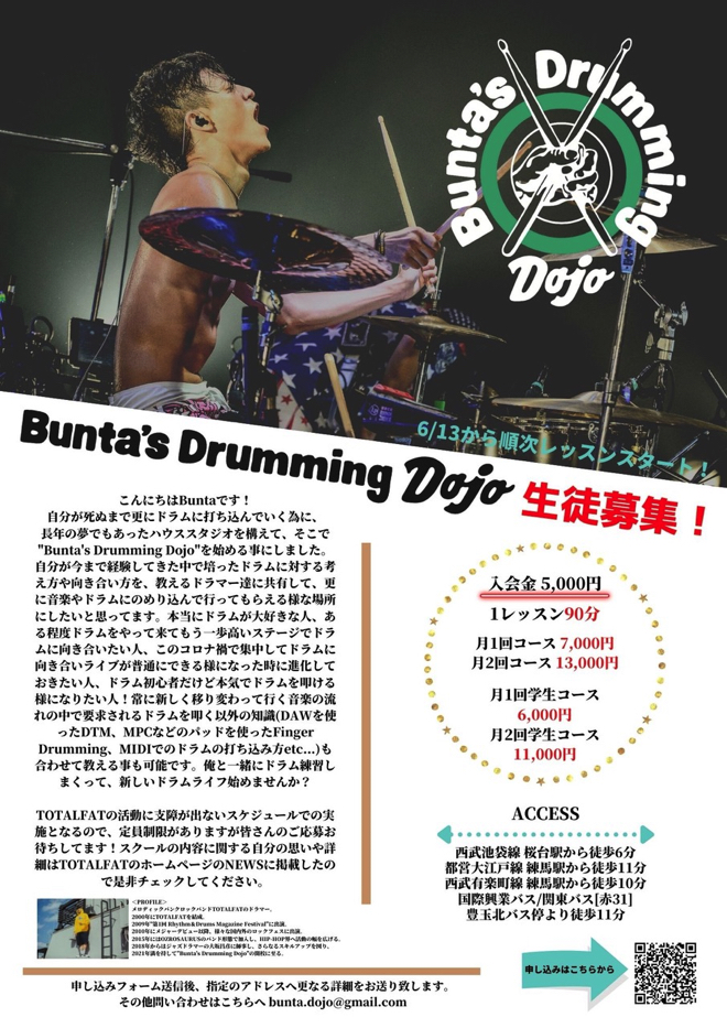 15歳でドラムを始めたBuntaは、2000年に高校の同級生であった現メンバーらとTOTALFATを結成。結成直後から年間100本以上のライブを行ってきた。「Bunta’s Drumming Dojo」では、20年以上にわたる活動を通じて培ってきた技術や知識をドラム初心者から更なる向上を目指すプロドラマーまでに幅広く伝授する。単にドラムのプレイ向上だけではなく、その経験から体の使い方、音符の捉え方、リズムに対する考え方、MIDIの入力の仕方やDTMの活用法など、それぞれの個性や目標に沿ったカリキュラムが提案可能だという。