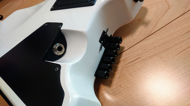 安定したチューニングはもちろん、ジャックの位置や本体に収納出来るレンチなど痒いところに手が届く仕様もさることながら、元々レスポールをメインとしていたのでアームが無いのも趣向に合っていましたし、見た目とは裏腹なボディの重さに親近感すら覚えました。