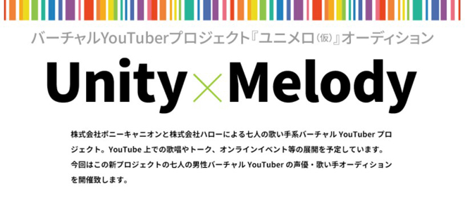 株式会社ポニーキャニオンと株式会社ハローがタッグを組んだ新規共同プロジェクトにて、男性バーチャルYouTuberキャラクターの声優・歌い手役の募集オーディションを開催する。