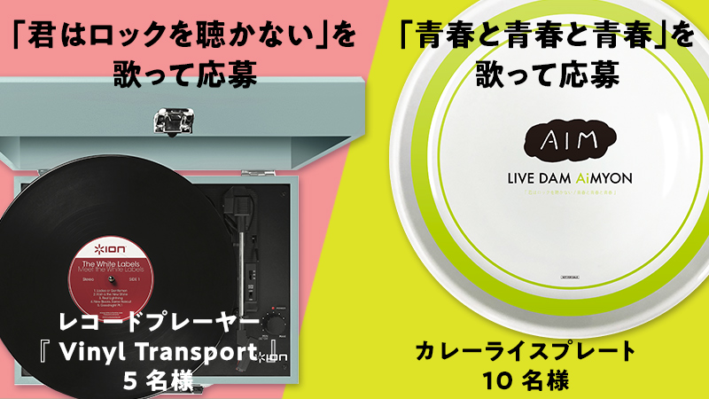課題曲を歌った方の中から、楽曲の歌詞にちなんだオリジナルグッズをプレゼント。「君はロックを聴かない」を歌唱すると「レコードプレーヤー」が、「青春と青春と青春」を歌唱すると「カレーライスプレート」が抽選で当たります。デンモクのキャンペーンページから楽曲を予約後、デンモクに表示されるQRコードより応募可能です。