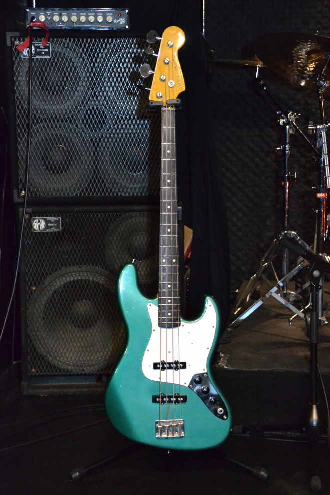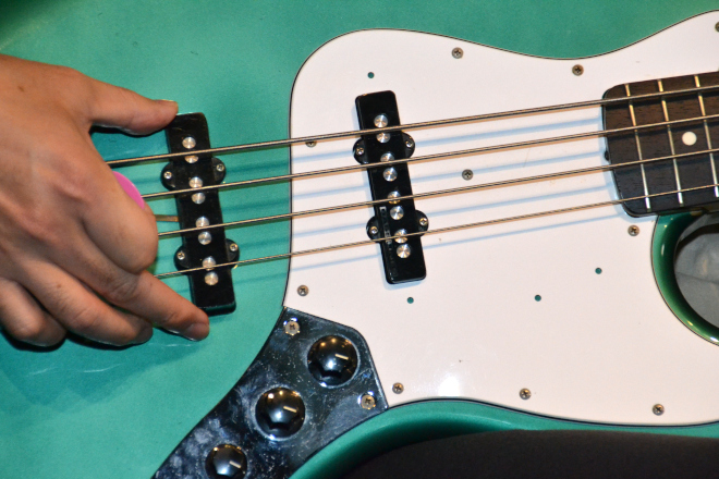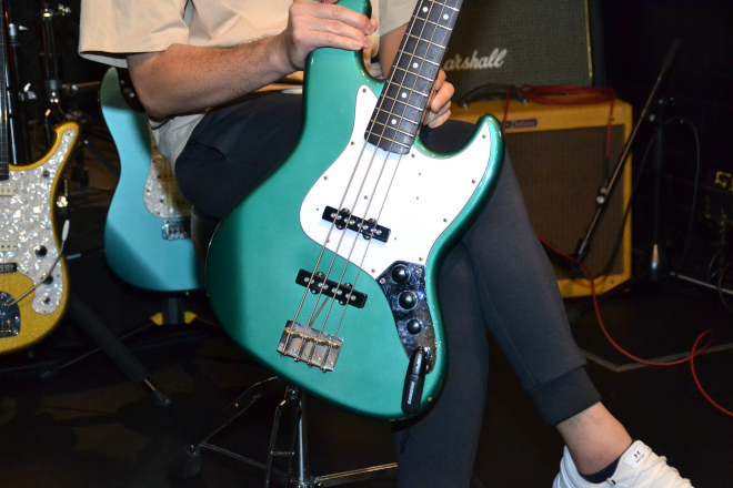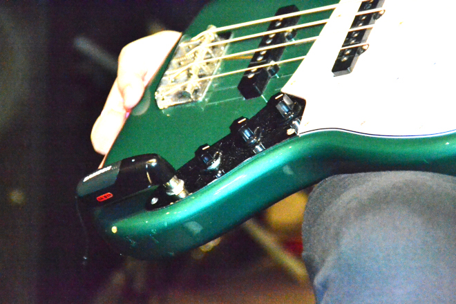 栗田伸広:(以下、栗田)フェンダージャパンのジャズベースです。もうほとんどこれ1本しか使っていません。これは実はギターの中さんからもらったものなんですよ。これと同じ色、オーシャンターコイズで、63年か64年のフェンダーのジャズベを持っていたんですが、20年前くらいにそれを手放したんです。その後、何かのタイミングで中さんが突然これを持ってきて。家にあるけど使わないからって。