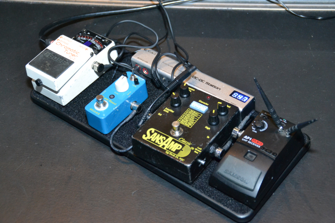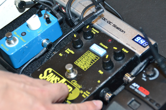 栗田:最近また復活したそうですけど、これは一番最初に出たときのものです。DIPスイッチでMid-BoostとかLow Driveとかを設定できて、基本的な音を決められます。さらに横のスイッチでアンプのモデルを選べるから、色々な音を作れるんです。周りに歪みをブワッとつけながら、アンプモデルをBassにしてミッドブーストして太さをキープ、とかすれば、ギターとカブらないようにできるし。