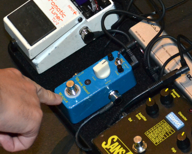 栗田:たぶん、生でベースだけを聴いたらすごく歪んでいると思いますよ(笑)。この青いのもオーバードライブで、MOOERのBlues Moodです。これでちょっと持ち上げたりもするし、ファズっぽく使ったりもしています。これも中さん提供です(笑)。かなり以前はマクソンのベースドライバーを使っていましたが、それがダメになってSansAmpを使い始めたころに、ここぞというところで使えるものとして中さんが貸してくれた。確かにクリアな歪みでいいなと思って、それからずっと使っています。