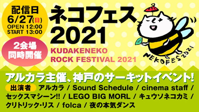 アルカラを中心としたネコフェス実行委員会とSPACE SHOWER TVが主催するライブサーキットイベント<ネコフェス2021>が、6月27日(日)に兵庫・神戸CHICKEN GEORGEと兵庫・神戸VARIT.の2会場にて各会場5アーティストで開催される。