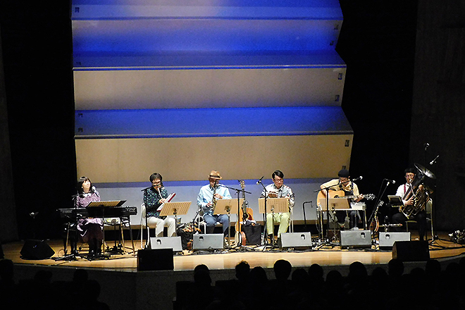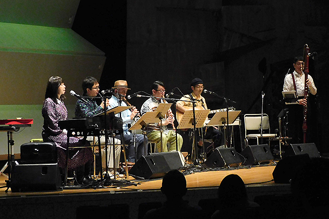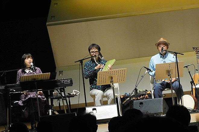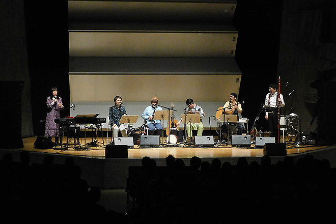 20分間の休憩をはさみ、第二部は谷山浩子オンステージ。栗コーダーカルテット、タバティ、安宅浩司を加えた6人編成で、まずは「わたしじゃない月のわたし」「マギー」と、谷山いわく“夜をうろつく歌シリーズ”2曲を披露。心配された体調も声もとても調子良く、これまでと変わらぬ美しく澄んだ歌声が会場いっぱいに響きわたる。栗コーダーカルテットとは過去に何度も共演しているが、谷山浩子の持つしっとりとした暗さや幻想的な物語性と、栗コーダーカルテットの持つアイリッシュトラッド風のおおらかさや哀愁との相性は抜群だ。