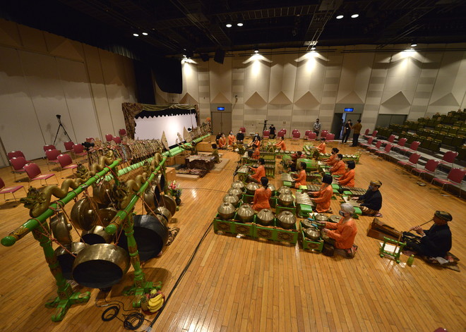 しかしひとたびホールに入ると、そこに並ぶ豪華絢爛なガムランの楽器たちの迫力に圧倒される。ホールの中央、ざっと15畳ほどのスペースに広げられた不思議な形の鉄琴や鉦、太鼓に弦楽器。大きな銅鑼の上には煌びやかな龍の彫刻が施されており、観客の口からは感動の声が漏れる。
