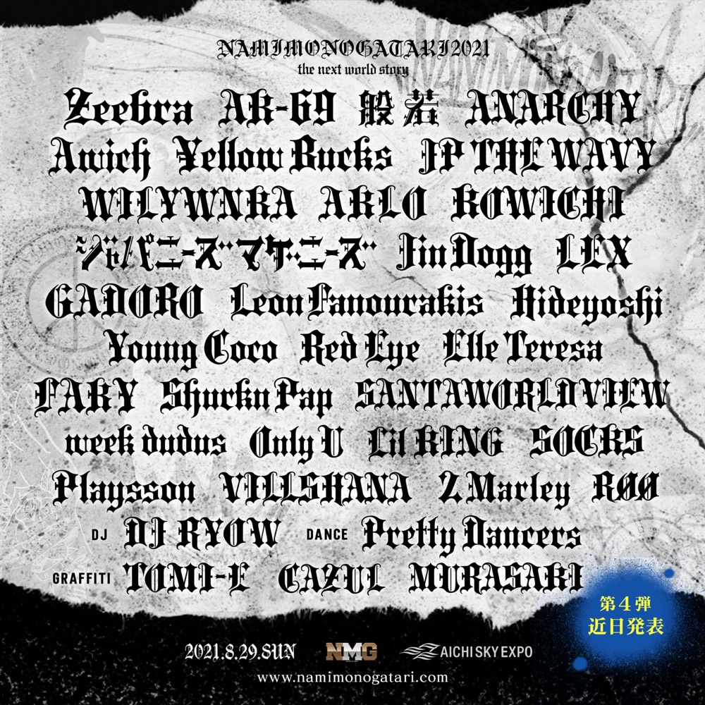 2005年からスタートした<NAMIMONOGATARI>は近年、東海地区のみならず全国のHIP HOPファンからの支持を受けるようになり、2011年・2012年には日本最大級のHIP HOP・R&Bビーチフェスとして伊良湖海岸で大成功を収めた。その後2年の休催を経て2015年に、原点でもある「Zepp名古屋」にて復活を果たし、そして2016年から2019年まで常滑りんくうビーチにおいて年々動員数を増やし、今年17年目となる同フェスは国内トップクラスのHIP HOPフェスへと成長。