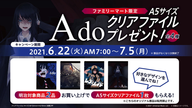Adoのオリジナルクリアファイルがもらえるキャンペーンが、6月22日7時より全国のファミリーマートで実施される。