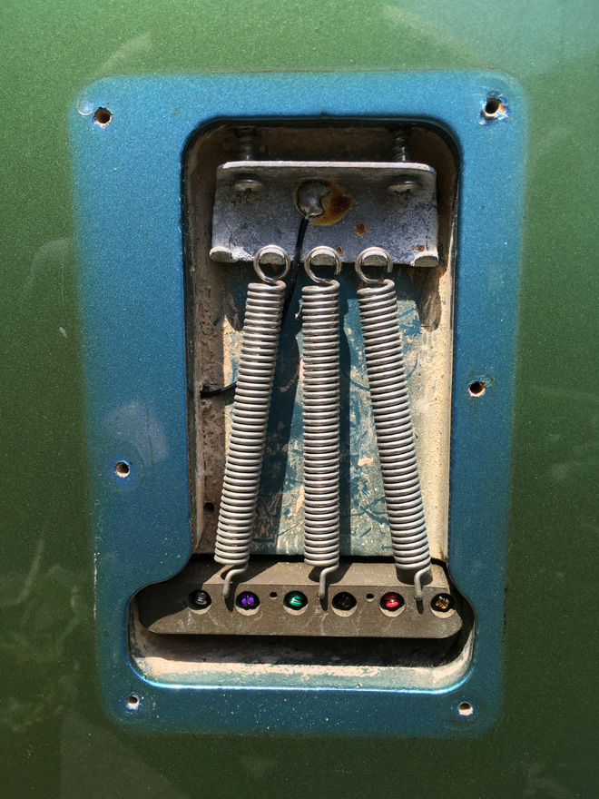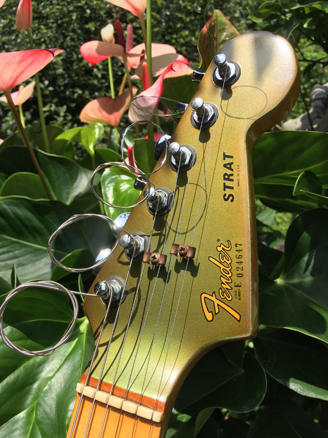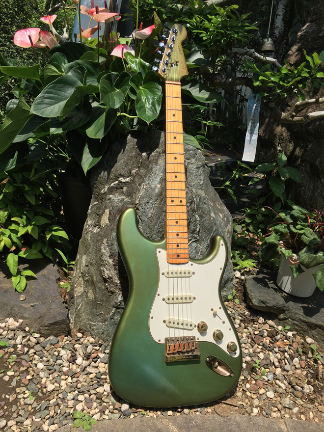 絶対シャーウッド・グリーンだと思いましたが、見事な退色。ヘッドなんか更に赤みも増しているようで迫力満点のカラーリングになっていますね。いつまでも眺めていられます。それにしてもフルオリジナルを保っているザ・ストラトなんて、今となっては激レアの一本。(JMN統括編集長 烏丸)