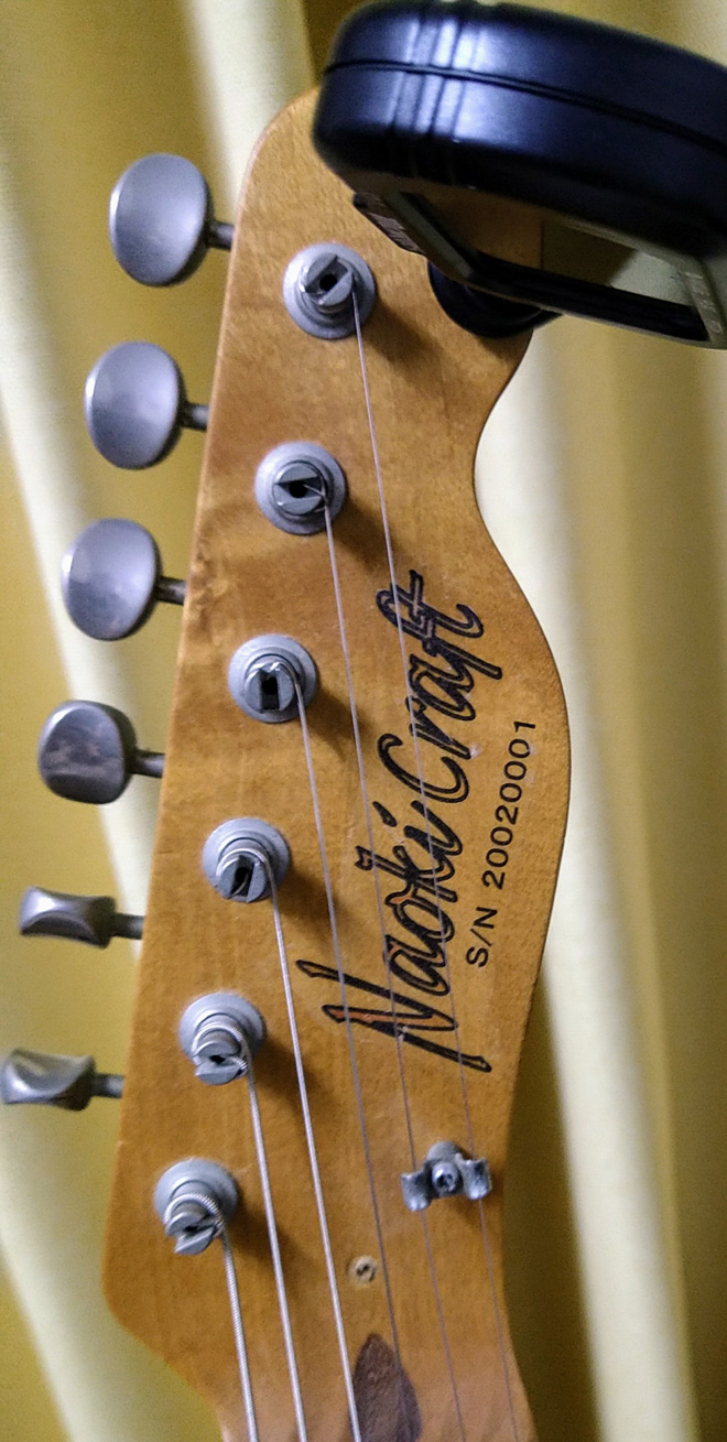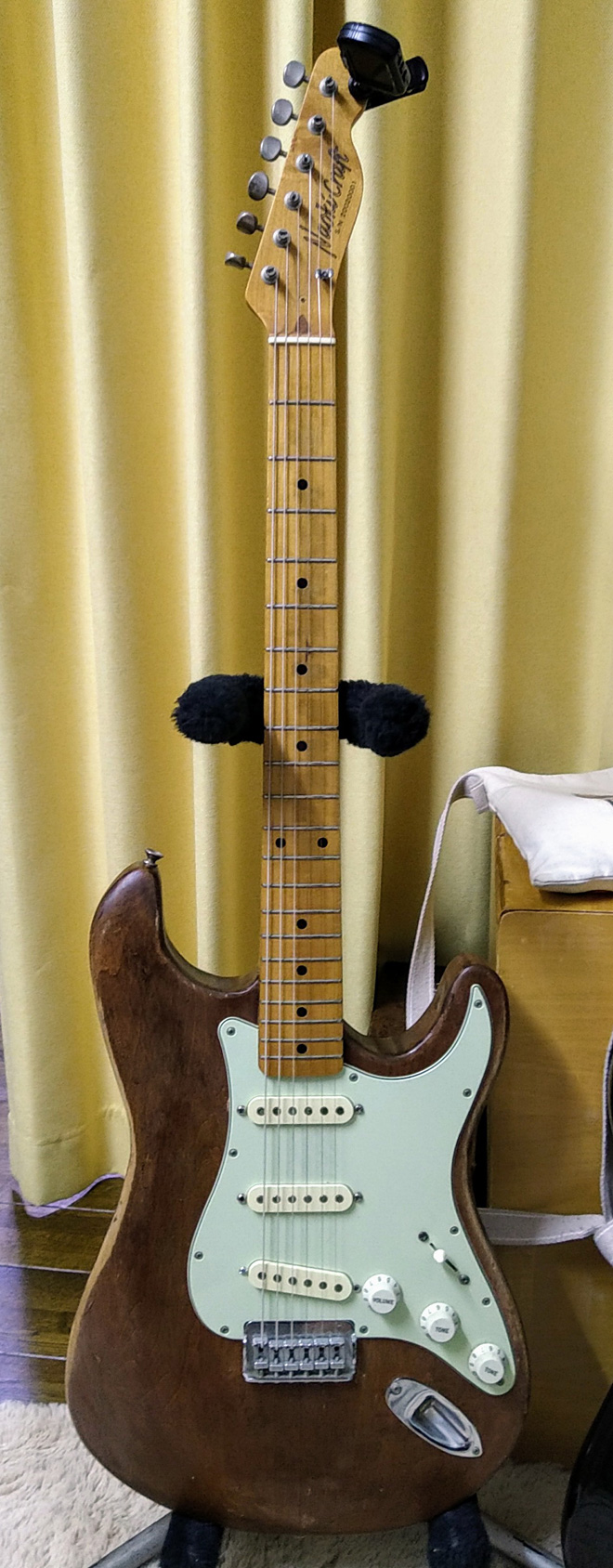 2002年なので19年前になります。3人の幼子の父をしていた頃(既に3人とも巣立ちましたが)アルダーボディのストラトがほしいが金が無い…なら作っちゃえ!と板を購入し型どるところからスタート。ボディは水性ステインとセラックニスで仕上げたため、めちゃ鳴り生の響きです。ピックアップはとっかえひっかえし、今は無名のモノですが程よく丸太いよい音です。何本かあるなかで未だにメインギターとして活躍中!おそらく死ぬまで手元に置いてあるんでしょうね。