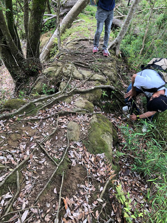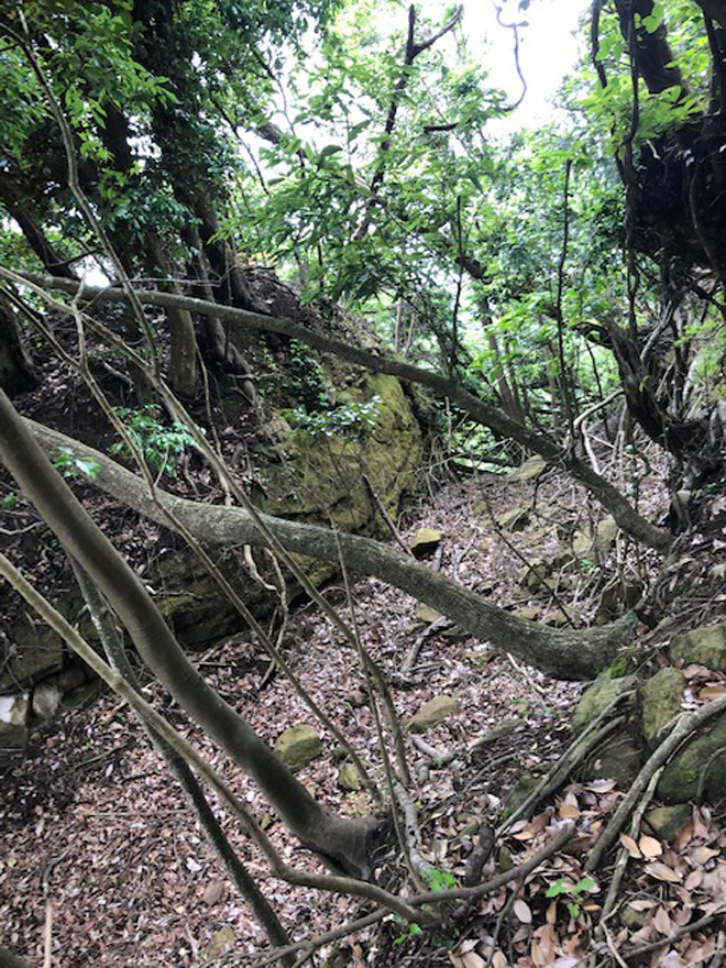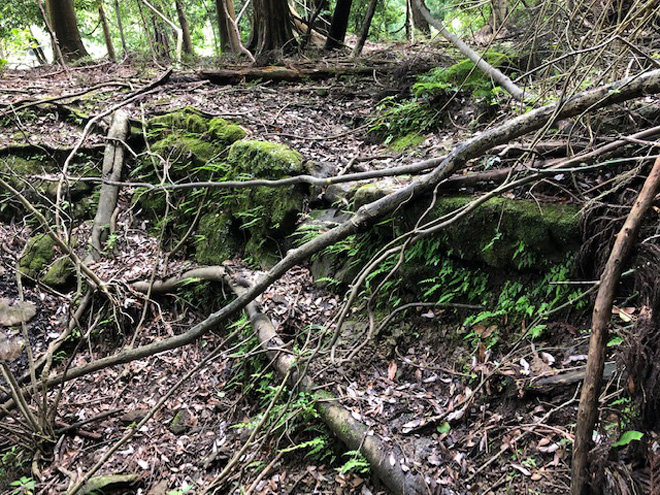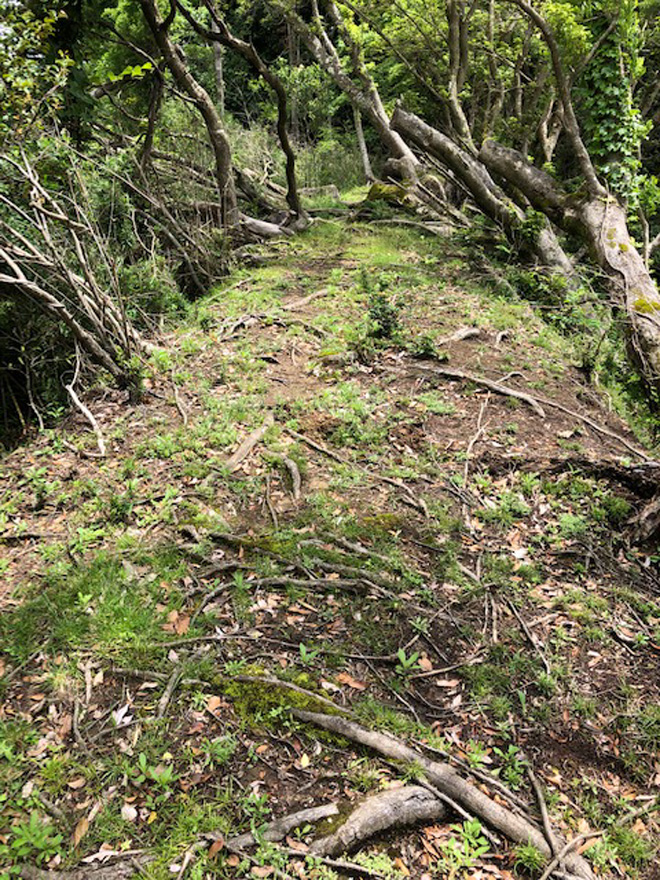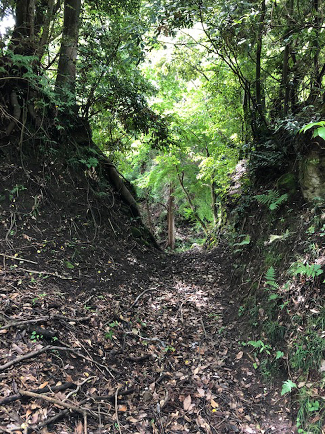 で、ここからが本番だ。この環神社の真下、いわゆる搦手の先にこの城最大の魅力である七ツ堀切が存在する。まず最初は環神社の階段を下り、裏の犬走り的な部分から堀切まで降りようと思ったが、これがまた道が無く、いわゆる崖なわけで、撮影するにも危険と判断し、もっと城を下った曲輪から回り込むことにした。だがどの曲輪の横を見ても回り込む道がない。前日が大雨だったこともあって泥濘も半端ない。女性との泥濘は好きだが歩くには困難だ。スタッフ共々ネットに書いてある見学情報をその場で調べたが確実な情報が見つからなかった。地主の方に電話して聞いて見ると、尾崎曲輪の手前の段の仕切りにイノシシを捕獲する檻があり、その後ろの道をぐるっと裏から回る導線があるという。いざそこから探検が始まったのだが、これがもう本当にサバイバルだった。確かに道らしき道もたまに確認出来る。だが台風でなぎ倒された木がいくつも行く手を阻み、常に湿地帯の中を歩くしかない状況。だがこの道だからこそ見れたものもあり、岩盤を削った堀切も発見、しかも石垣もある。東側にも平らな曲輪が存在したのだ。来城する前にネット検索した峯上城の平面図にはこの辺りの曲輪や空堀、岩盤堀切は描かれていなかったのである。そりゃそうだ、こんな道を通る人なんていないはずだしな。これは新しい発見だった。音楽雑誌でデュランデュランのメンバーの首の髭のかすかな剃り残しを発見したような気分である。最初の掲示板に書いてあった倉屋敷というのがこの辺りの曲輪を言うのかもしれない。だが最初にも言ったように体力と好奇心と運動神経がないとお勧め出来ない。とにかく危険なのである。