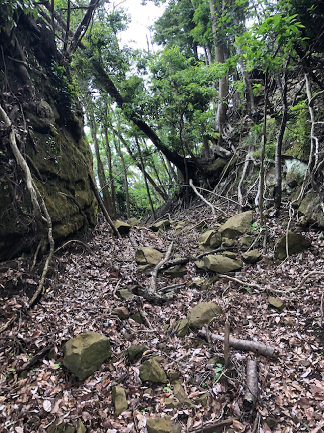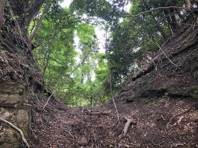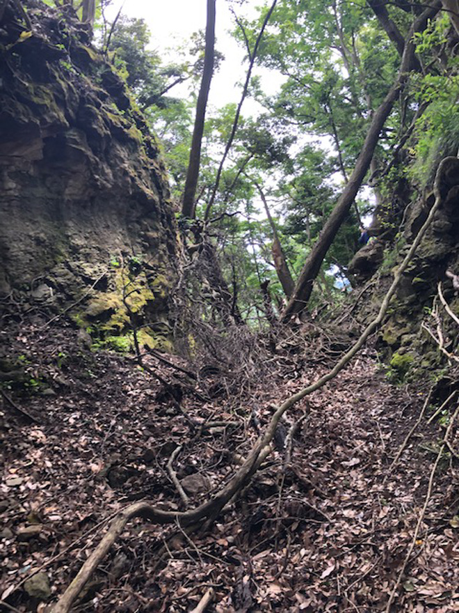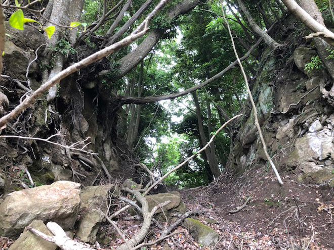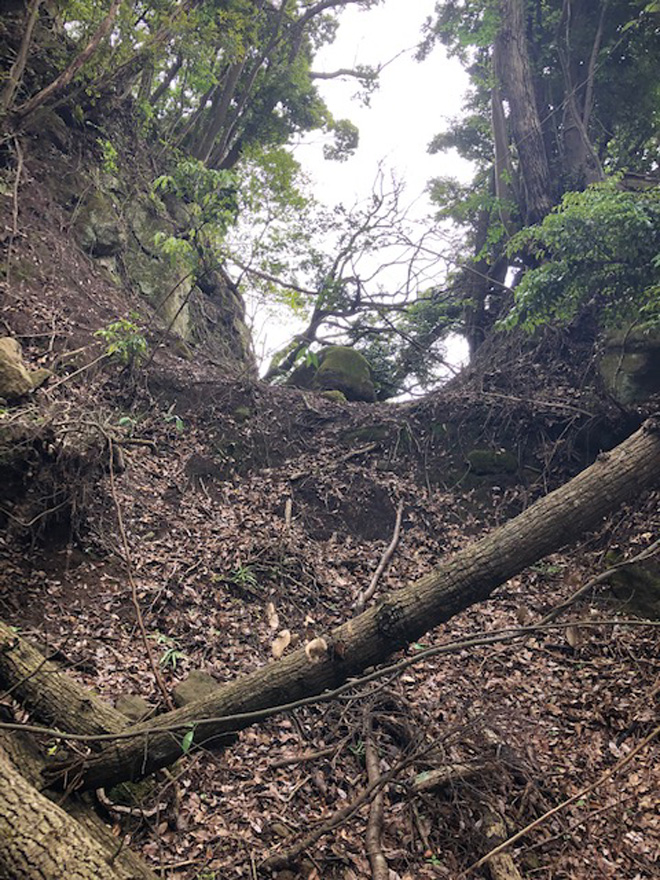 泥だらけになりながらもなんとか環神社の真下にある七ツ堀切の一つ目の堀切に到達出来た。凄い深さである。しかも両サイドが絶壁だ。これは堀切を作るにも相当苦労したと思う。圧巻だった。だがここで終わりじゃなく、7つすべての堀切を撮影&見学しようと思ったのだが、これまた移動する道とスペースがない!スニーカーだと岩盤で滑ってマジで危ない。どちら側から次の堀切りに渡るか両サイドを良く見ながら判断しないと本当に危ない。そもそもここは攻められない為に作った堀切であって、堀切の上を橋で渡っていたわけでもなく、見張り役の導線になっていたわけでもないので本当に道がないのである。良くぞここまで徹底して7つも作ってくれたなと脱帽。意地悪にも程があるが、その徹底した防御が搦手を守り抜くぞというプライドだったのかもしれない。搦手から攻められたくないということと、地形的には本丸裏の防御が弱かったと自覚した上での七ツ堀切だったのかもしれない。凄い。とにかく凄まじい。「裏の防御が弱い」この響き、この上半期で一番の、ジワジワエロいで賞に認定。