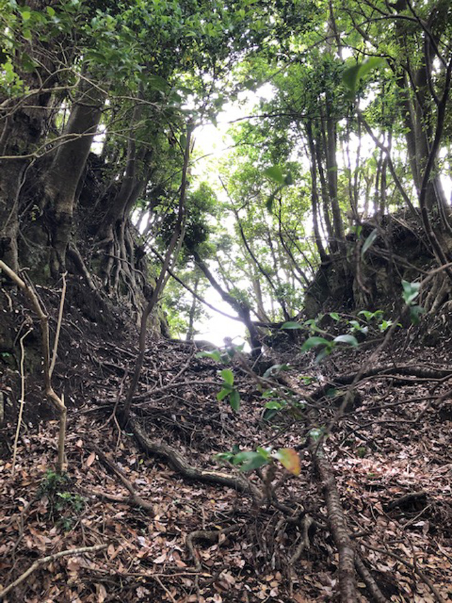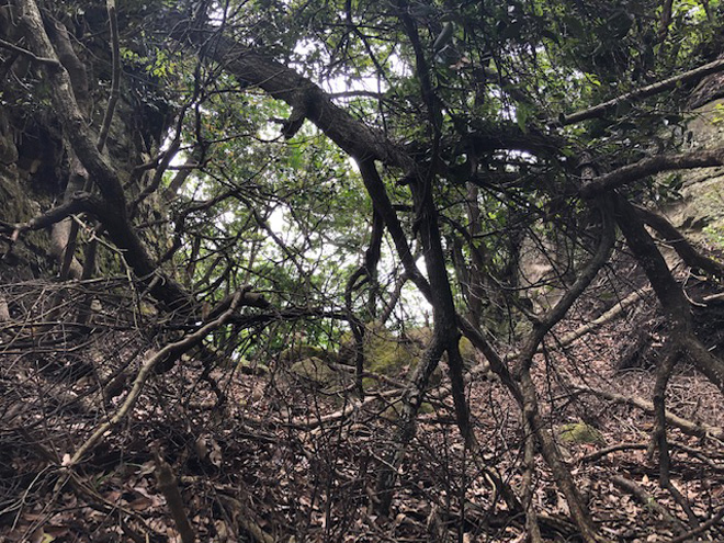 7つ全部の堀切を見て感動していたがここから戻らなくてはいけないことを完全に忘れていた。帰りがマジでキツかった。トレッキングは帰りの事故が多い。来た道も戻りになると同じ道は辿れなかったり登れなかったりする。行きはなぎ倒された木を飛び越えたりしたが、帰りは木の下を泥だらけになりながら潜ったりもした。夕方になると極端に視界が暗くなるので朝からの見学をお勧めしたいし、晴れた日じゃないと本当に危険だということはお伝えしたい。前日が雨でなければ、環神社の裏を滑り降りて七ツ堀切を見学出来るのかもしれないがこれまた戻りが大変だとも思うので本当に気を付けていただきたいと思う。
