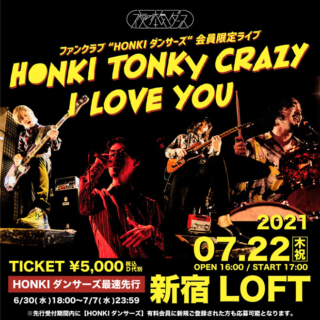 夜の本気ダンスが、7月22日(木・祝)に新宿LOFTにて、初めてファンクラブ限定ライブ<HONKI TONKY CRAZY I LOVE YOU>を開催することを発表した。