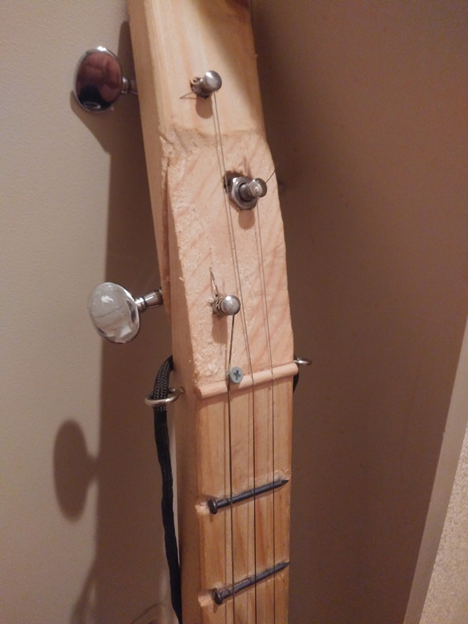 ネックはホームセンターの角材。フレットは釘。ブリッジはテントに使うスチールペグ……とっても好きな見た目です。おまけに自作のピエゾピックアップも内蔵しています。もう、いうことはありません。音も愛嬌のある音色です。ちょっと音痴かもしれません。