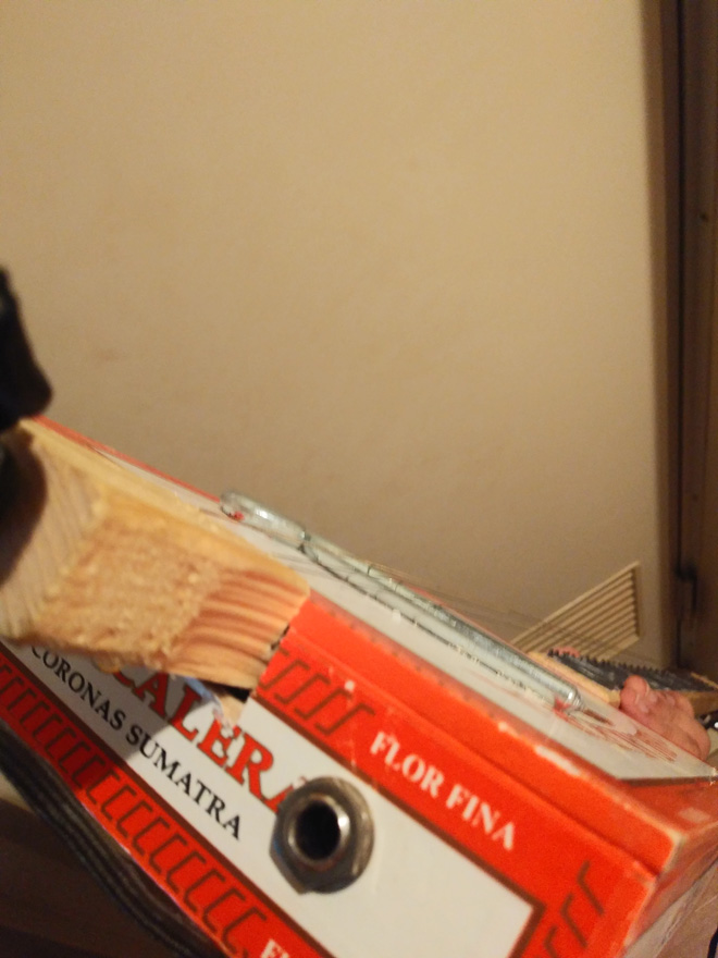 シガーボックスギターという、葉巻の箱を再利用したギターがあるということを知り、その作り方の資料集めにはネットを使い、材料集めには100均と中古屋を巡りました。最後に葉巻の箱はもらい物。しめて3000円かそこらくらいで完成した愛機です(これを作るまでに3、4本の「使える」試作品ができまして、全部で10000円は越しているかもしれませんが)。