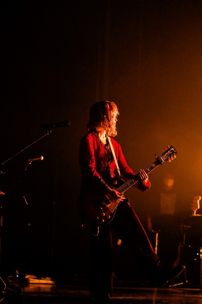 暗転したホールの静寂へ、藤川は赤のアンティークジャケットに髪飾りを合わせた彼女らしいユニークな衣装で姿を現した。ステージ中央に到着した彼女が“走るあたしは止まんないよ”と高らかなアカペラで歌い上げるとそれに応えるようバンドは即座にヘヴィなプレイをスタート、この夜のライブは「四畳半戦争」で幕を開ける。