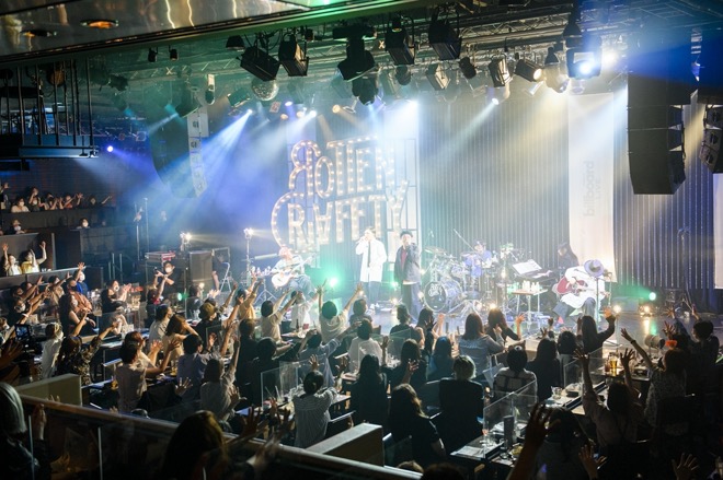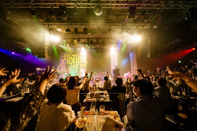 「目は口ほどに物を言うから、その目ン玉で思い切りライブしてくれ」とN∀OKIが告げ、KAZUOMIが「来いよ! もっと来いよ!」と煽って「D.A.N.C.E.」へ。ROTTENGRAFFTY初のBillboardだが、果たして今までこんなに激しいライブがここで繰り広げられたことはあったのだろうか?とちょっと心配しまうほどの爆発的な盛り上がり。とにかく楽しい。会場全体が一緒になってライブをするという、とんでもなく楽しい瞬間の連続だ。HIROSHIのドラムに合わせて鳴り響くたくさんのクラップ。N∀OKIが更に大きなクラップを観客に要求し、その音量が最大になったところで「アンスキニー・バップ」へ。駆け上がるようなビートに心が踊り、KAZUOMIのギターソロに笑みが咲き、N∀OKIとNOBUYAの歌に引っ張られて自然と身体が動く。我々が少しの間だけ忘れていた“ライブは楽しい”という感覚を思い出させてくれるようでもある。