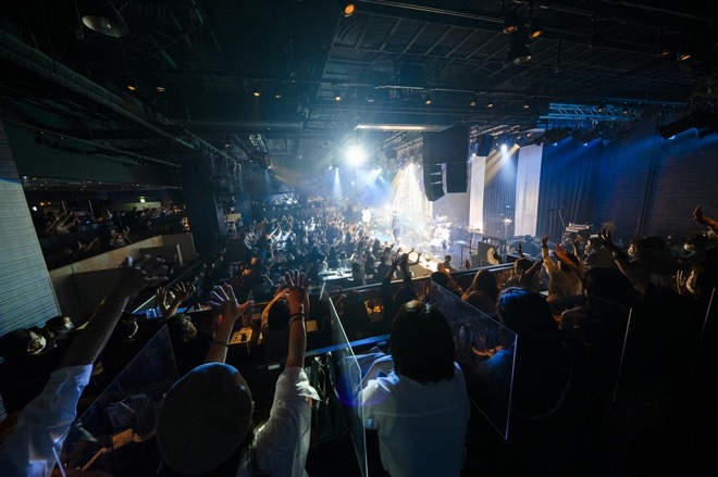 そしてキラキラとした輝きが目に見えるようなギターの音色で始まった「「70cm四方の窓 」~君のいない空~」。この楽曲に込められた情景が眼前に思い浮かぶような奥深くて叙情的なサウンドと歌。胸に染み入るステージで魅せた同曲は、間違いなくこの日のハイライトのひとつだった。NOBUYAとN∀OKIが立ち上がって「NO THINK」がスタート。一気に熱くなった空気の中、会場が大きな一体感に包まれたまま「南口」へと続き、軽快なリズムに会場が揺れてマスクの下の笑顔が揺れる。曲の最後にN∀OKIが「音楽、ありがとう!」と叫び、客席からは更に大きな拍手が起こった。