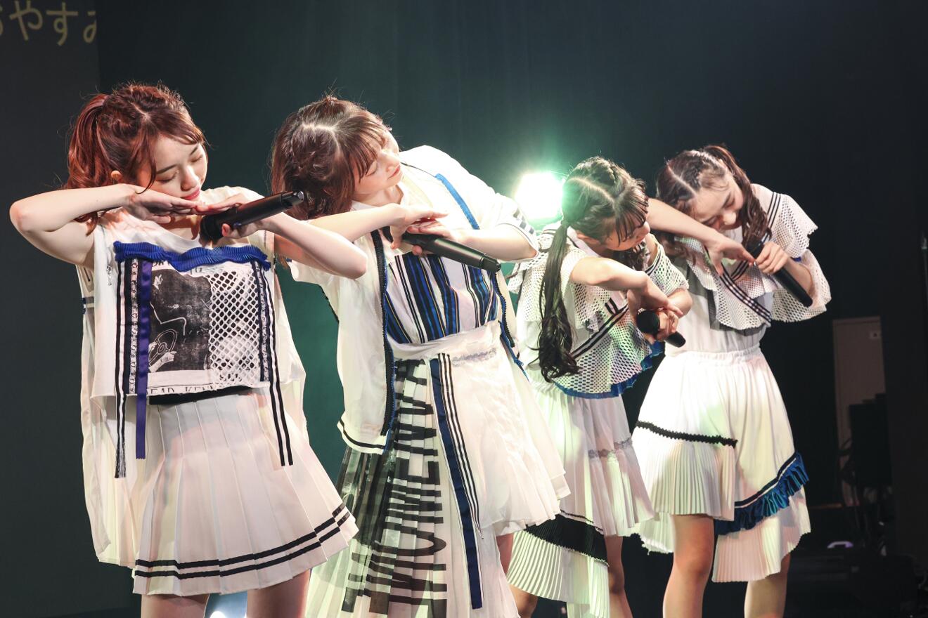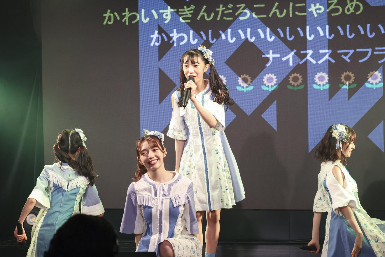 4つの選択肢から僅差で「スマイルフラワー」「寝具でSING A SONG」「OUR COLOR」「スーパースター」が選ばれた。わずかな作戦会議の後、早速始まる「スマイルフラワー」を今日のライブの成功を確信させるような気合十分のパフォーマンスで歌い切るとアドリブさながらに曲間つなぎの移動も綺麗に決めて続く「寝具でSING A SONG」へ。高井千帆の伸びやかなソロパートは直前に決まったとは思えないほどで、高音と低音のハーモニーが印象的な楽曲をメンバー全員で躍動感あふれるパフォーマンスと共に見事に歌いあげた。